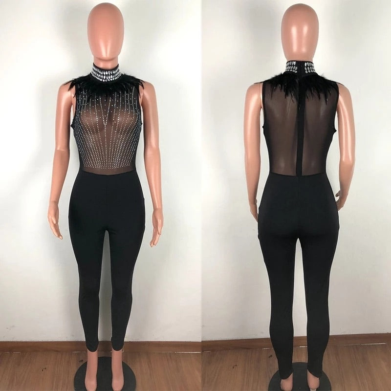 Rhinestone Embelished Accent Jumpsuit Stretch Fit stones around collar zipper back easy fit