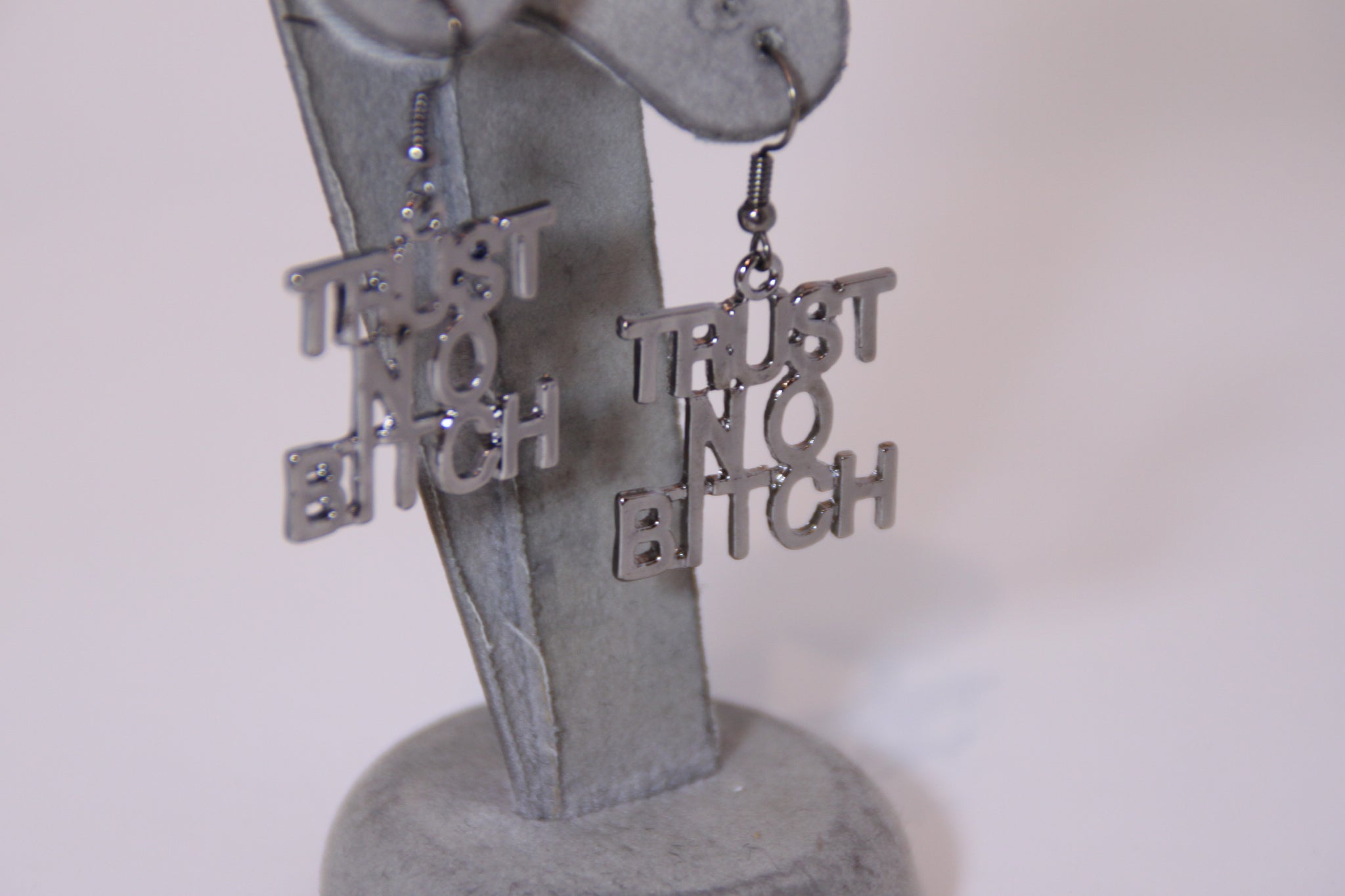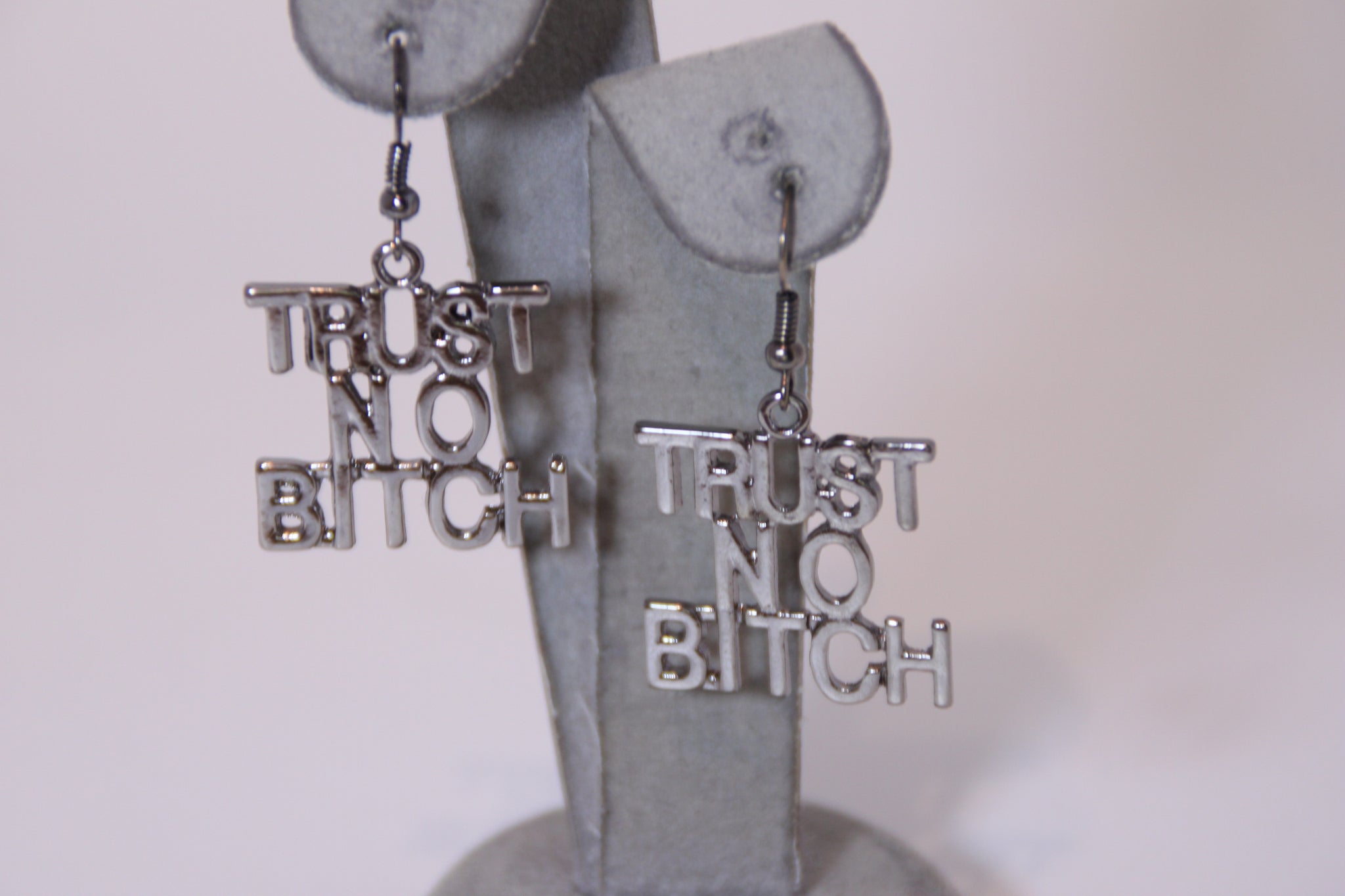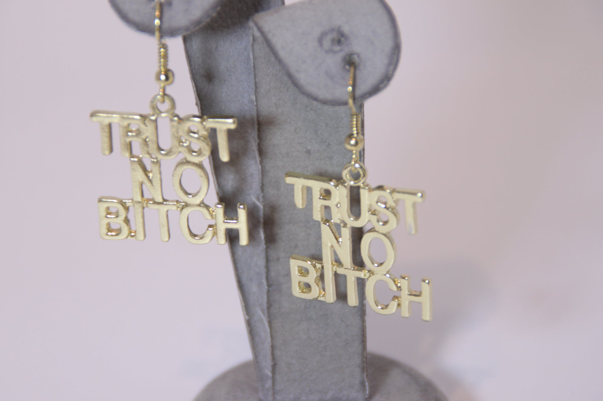 Trust No Bi*** Dangle Earrings Comes in Gold and can be purchase in Silver hook back closure
